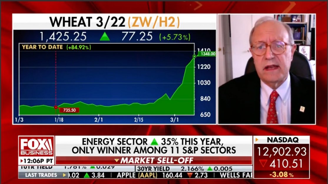 Strategic Resource GroupWith the price of wheat spiking to an all-time high, Burt P. Flickinger, III discussed the implications for consumers with Liz Claman on the CLAMAN COUNTDOWN. The price of a box of cereal or pasta will not go down even when crop commodity costs decline because of brand manufacturer price-gouging, and consumers may go back to wearing plastic bread bags to protect their shoes as they did in the 70s when they couldn't afford to buy a new pair It's a crisis of unprecedented proportions that will be worse at the end of the year because Ukraine is the bread basket of the world and can't plant crops in wartime, combined with reduced production in Brazil, Argentina & Australia, and bad weather in the US & Canada as reported on FOXWEATHER.com. Production worldwide is going to be the worst it's been in several crop years.