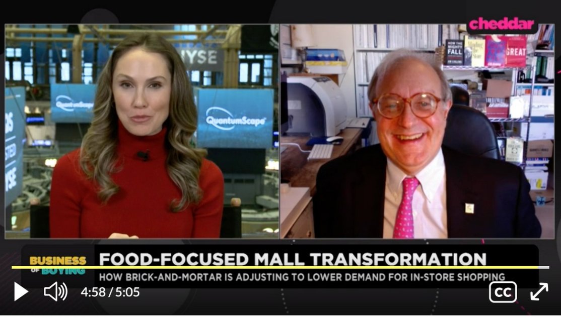 Strategic Resource GroupThe re-purposing of the 20th century Roman Empires of Retail centered Burt P. Flickinger, III's conversation with Kristen Scholer on Cheddar -- from food- and pet-based retailers to gaming to Top Golf and MFCs: Micro-Fulfillment Centers to more & better sustainable power of Rooftop Solar, led by Amazon's Brittany Stanton & Greg Michaelson, to help lower prices, offset rising wages, logistics and utility costs. The balance between online and bricks & mortar will improve as US malls move from from about 400% to 140% over-stored, facilitating a Retail Requiem & Renaissance.